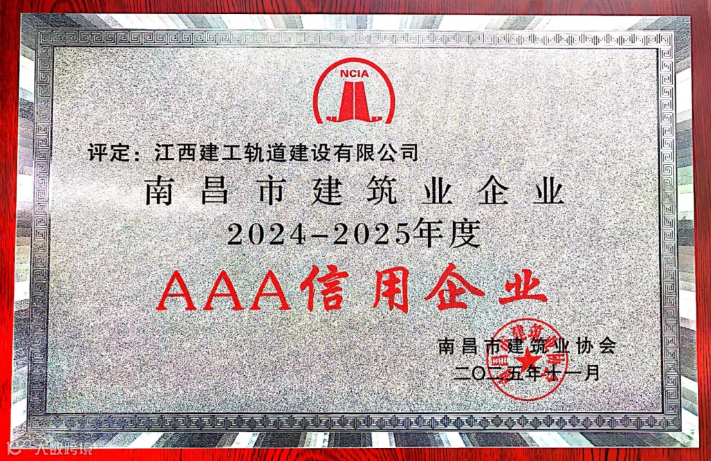 近日,江西建工轨道建设有限公司喜获南昌市建筑业协会授予的“南昌市建筑业企业2024-2025年度AAA信用企业”称号,这是行业对公司诚信经营理念与实践成果的高度认可,更是社会各界对公司品牌价值的充分肯定。