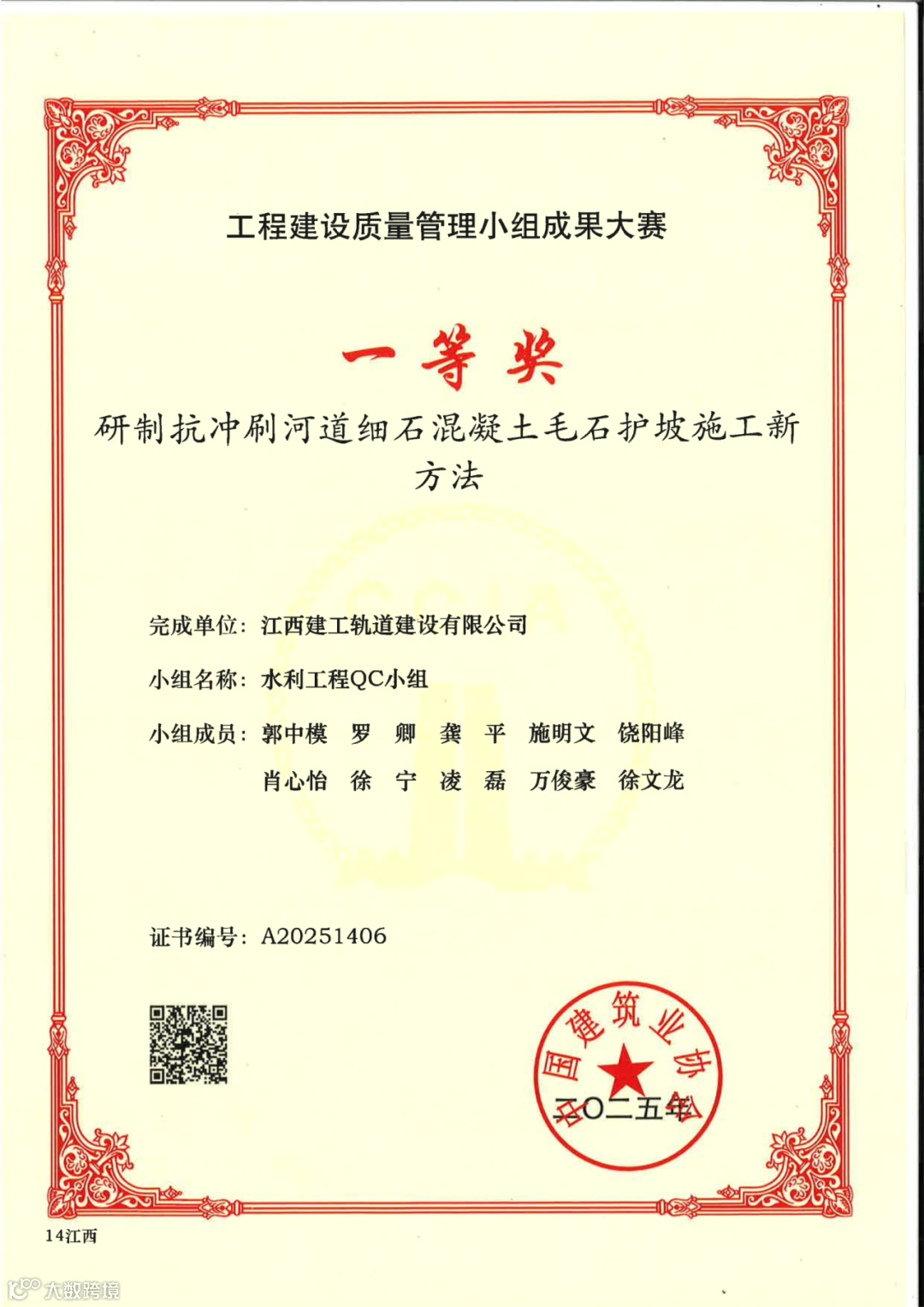 在高手如云的赛场中,公司的参赛成果凭借硬实力脱颖而出。其中,由公司水利工程QC小组发布的《研制抗冲刷河道细石混凝土毛石护坡施工新方法》更是一举摘得全国QC大赛一等奖桂冠,这是公司在该赛事中首次获此殊荣。