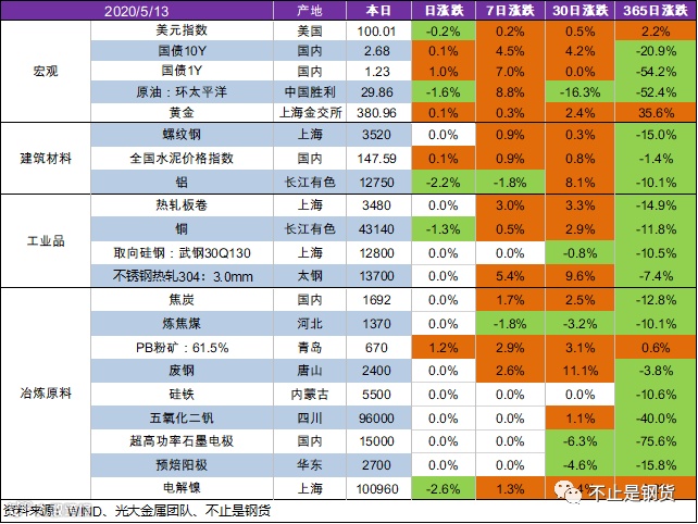 5月13日美元指数环比下跌0.2%;十年期国债环比上涨0.1%;一年期国债上涨1.0%;原油价格环比下跌1.6%;黄金价格环比上涨0.1%;螺纹钢价格3520元/吨,环比持平;热轧板卷环比持平;PB粉矿:61.5%环比上涨1.2%;焦炭价格环比持平;全国水泥价格指数环比上涨0.1%;废钢价格环比持平;电解铝价格环比下跌2.2%;电解镍价格环比下跌2.6%。