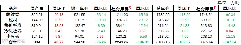 据Mysteel监测,本周钢材社会库存量2241.26万吨,样本钢厂库存量944.9万吨,钢材总库存合计3186.16万吨,周环比减少182.57万吨。