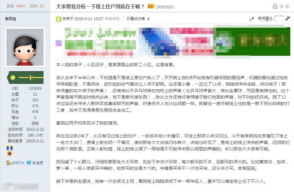 我住在这快2年了,从没有见过楼上的住户,一般或多或少会撞见,可楼上那家从来没见过。今天有幸我妈在家撞见了楼上一老太太出门,便凑上前去问一下情况,谁知那老太太说话闪烁其次,说她也听见了,是楼上的楼上传来的声音,还问我们住哪个房卧室。正常人都知道,楼上的楼上隔了一层楼是不可能传来那么明显的声音的。所以那老太太非常可疑。