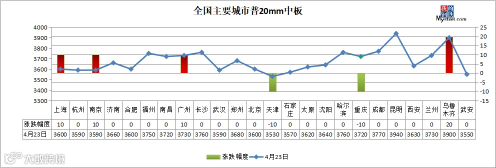 中厚板:4月23日,全国24个主要城市20mm普板均价3676元/吨,较上一交易日均价上涨1元/吨。市场方面,今日期货走势高开低走,市场商家走货为主并没有大幅拉涨报价,市场实际成交不佳,导致价格有阴跌现象。成交方面,今日市场低价走货顺畅,但高价资源出货相对困难。其中部分市场低合金资源趋紧,且全天低合金出货偏好,价格也相对坚挺。综合来看,目前贸易商心态未有明显好转,基本仍以去库存为主,预计今日中板价格将偏弱运行。