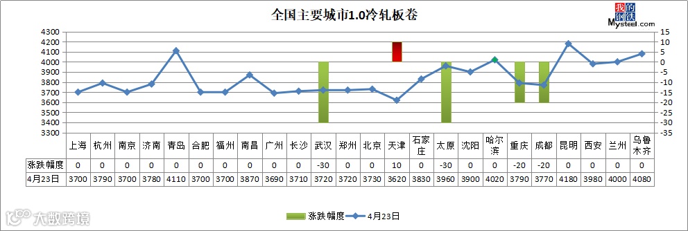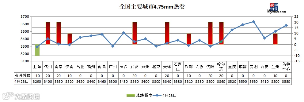 热轧板卷:4月23日,全国24个主要城市4.75热轧板卷均价3408元/吨,较上个交易日上涨6元/吨。今日黑色商品期货市场高开低走,收跌0.09%,现货市场早盘报价小幅上涨,涨后成交乏力,盘中期盘回落,现货市场因上午成交弱势,价格随盘而下,但跌后成交也没有明显改善。目前产量有所回升,钢厂利润处于边际,库存继续下降,降幅扩大,热卷下游需求恢复速度加快,其中不乏亮点行业如挖掘机、重卡。
