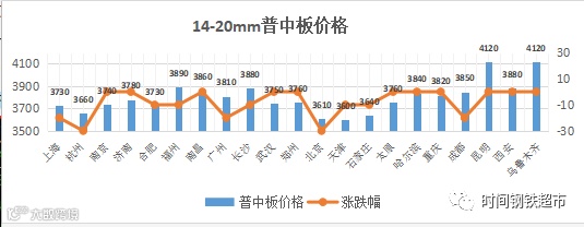 【中板】中板跌幅10-20元。全国21个主要市场14-20mm 普中板平均价格3801元/吨,较上个交易日下调8元/吨。