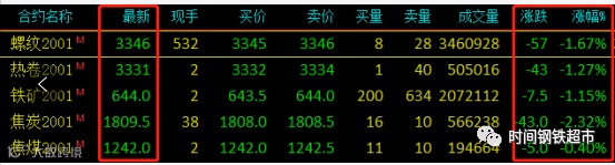 继昨日夜盘黑色系集体大跌后,日内期货继续走弱,尾盘小幅回升最终收跌。期螺跌幅57收报3346,收出一根十字线,反映多空双方在该位置争夺激烈,关注明日走势,判断是否能够止跌企稳。原料端近两日明显走弱,铁矿石跌幅1.15%报644,焦炭跌幅2.32%,成本支撑减弱。