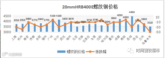 【螺纹钢】螺纹钢跌幅10-50元,全国23个主要市场螺纹钢 20mm HRB400E平均价格3844元/吨,较上个交易日下调17元/吨。
