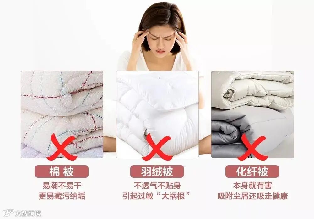 普通棉被:一直以来,棉被被老百姓广泛使用,但它不仅重,用久了还会受潮结团,变成细菌螨虫滋生的温床。