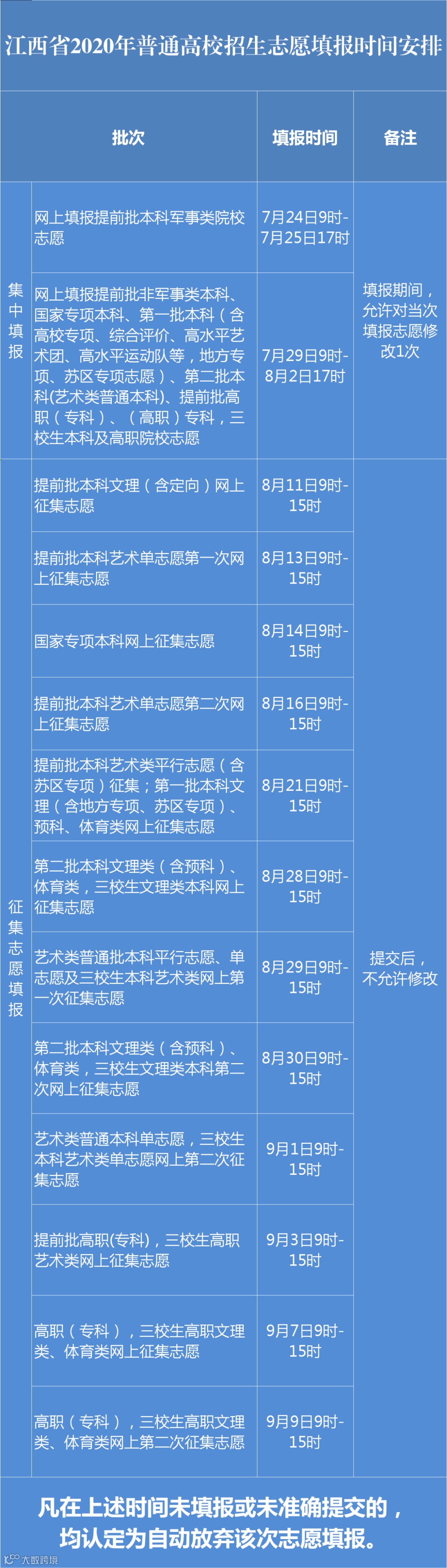 高考顺利结束,江西省将于7月23日公布高考成绩。在这段时间内,考生除了可以好好享受假期,也可以先了解一下志愿填报。今天就给大家带来江西省2020年普通高校招生志愿填报时间安排和志愿设置情况,一起来了解↓↓↓