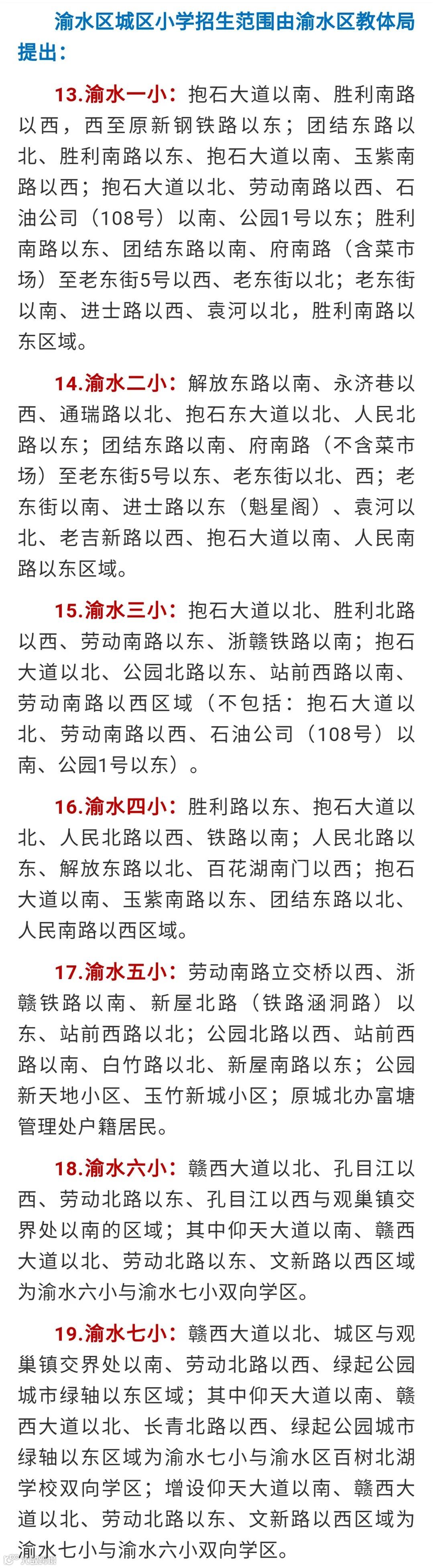 一、继续深化“多向学区”改革。渝水二小与渝水八小、市三中与市二中的双向学区,市暨阳学校、市长青小学、市铁路小学的三向学区范围继续保持不变。增设市逸夫小学与市明志小学、市逸夫小学与百树北湖学校、渝水七小与百树北湖学校、渝水七小与渝水六小、市长青小学与百树北湖学校、市长青小学与渝水十一小、市暨阳学校与渝水十一小、渝水三中小学部与市铁路小学、渝水十小与市西湖小学等9个小学双向学区,渝水三中与市九中、渝水三中与市一中、市实验中学与市五中、高新一中与市十六中等4个中学双向学区;增设市逸夫小学、市明志小学、渝水十小和市实验中学、市五中、市九中2个三向学区;所有片区外协议小区增设为片区学校和协议学校的双向学区。双向和三向学区内新生年级适龄少年儿童可以在学区内学校中任选一所入读,相关学校不得拒收。