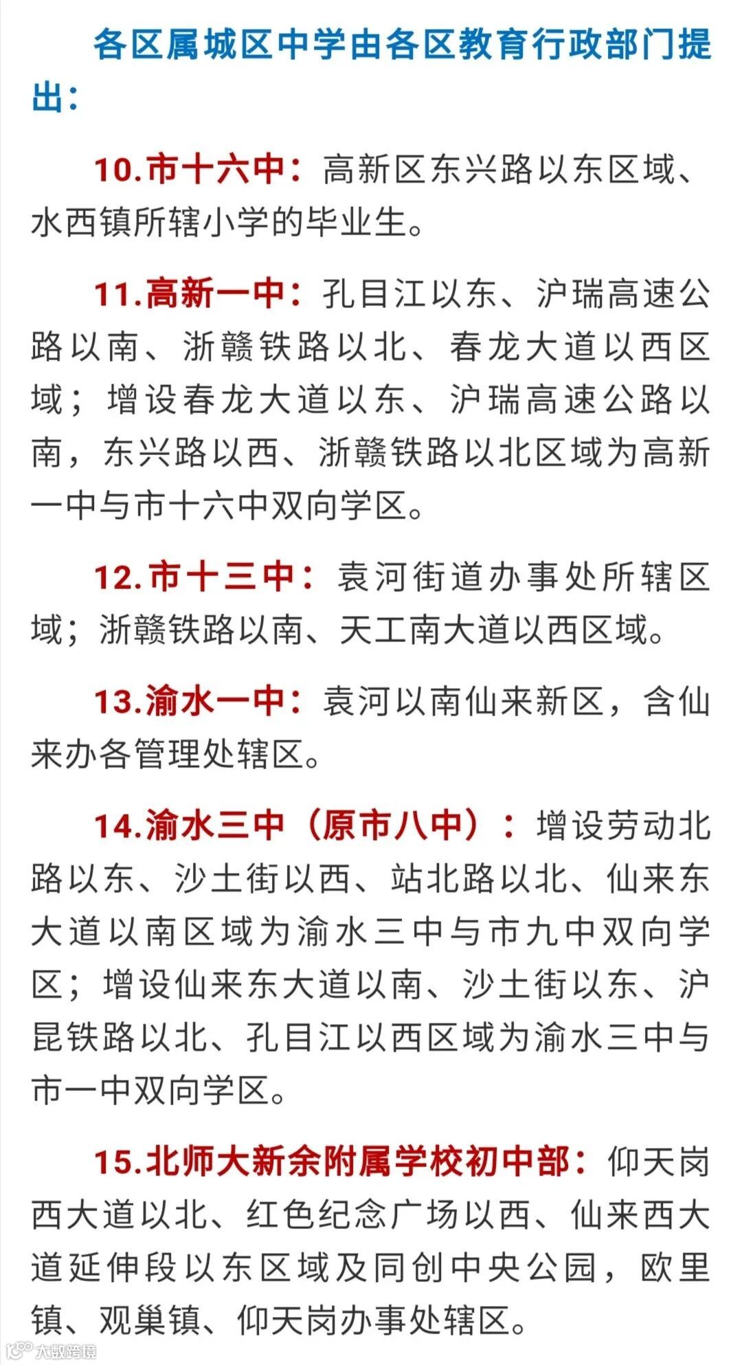 二、新设置学区。原燕子山小学、毛家小学、市八中调整为渝水区教体局直管,并分别更名为渝水十小、渝水十一小、渝水三中。渝水十小、渝水十一小分别由渝水七小、渝水六小托管。增设渝水十小、渝水十一小、渝水三中和百树北湖学校双向或三向学区,具体由渝水区教体局划定。增设高新一中学区,具体由高新区社会发展部划定。