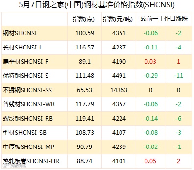 ◆5月7日,钢之家(中国)钢材基准价格指数(SHCNSI)为100.59点(4351元),较上一交易日下跌0.06(2元)。昨日主要市场钢材品种价格涨跌互现。具体情况如下: