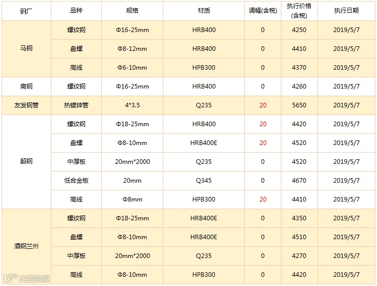 5月7日,国内34家钢厂调整出厂价格。其中: