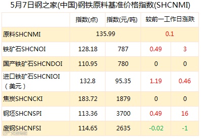 ◆7日铁矿石市场有所上涨,钢之家62%进口矿指数(SHCNIOI)95.35涨0.46美元;65%国产矿指数(SHCNDOI)780元稳;