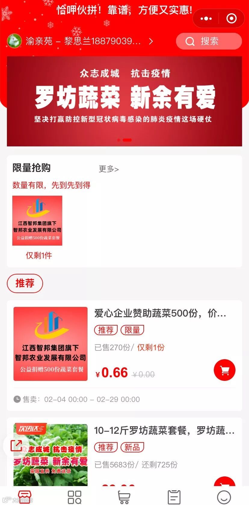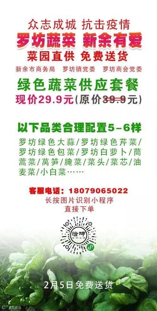 在这场爱心公益蔬菜捐赠中,江西智邦集团旗下智邦农业发展有限公司董事长简金勇先生承诺:疫情期间,蔬菜都是当天采摘,当天配送,确保大家吃到的都是新鲜的蔬菜。大家只要长按下图片识别小程序,登录微信小程序“恰呷伙拼”,就能很方便地下单订货。