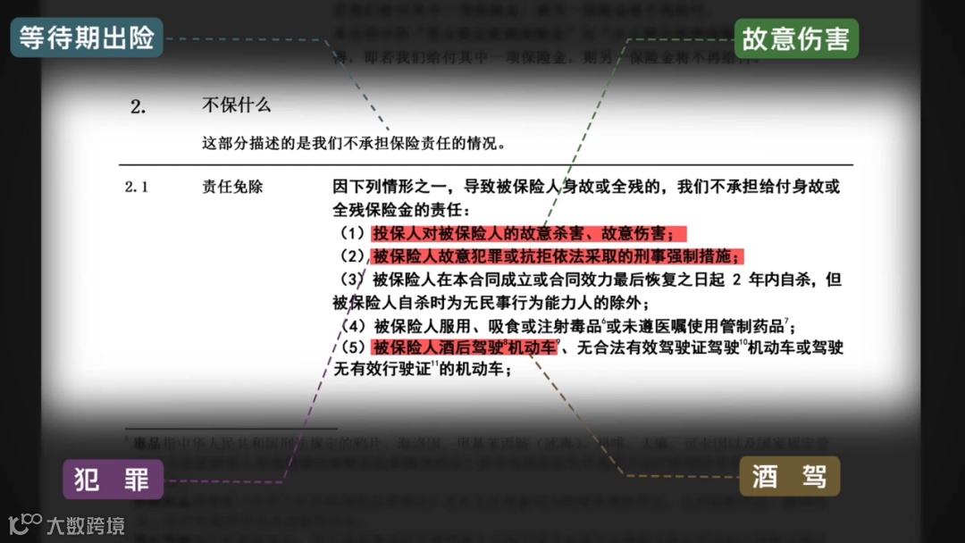 了解了每个险种都赔什么,再看看哪些情况下保险公司不能赔。看合同里的免责条款即可,一般常用的责任免除主要有以下这几种:
