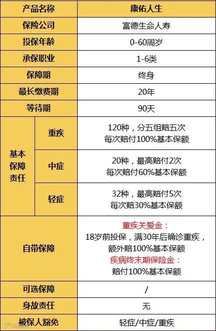 在重疾重新定义后,只有少数几家公司推出了几款单次重疾险产品,富德生命人寿率先推出了首款新规定义下的多次分组型重疾险产品——康佑人生。按照重疾新规的定义做了调整,最大的亮点在于未成年人投保,到中老年时期重疾出险最高可赔2倍保额。