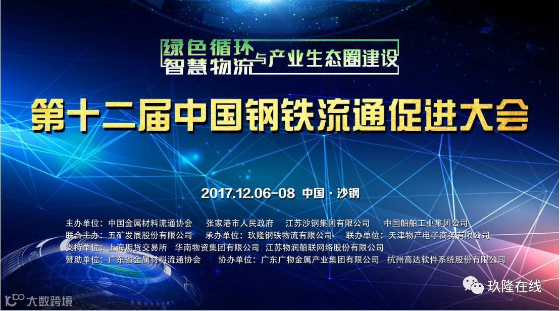 2017年12月06-08日,中国金属材料流通协会,江苏沙钢集团有限公司,中国船舶工业集团公司主办,玖隆钢铁物流有限公司承办的第十二届中国钢铁流通促进大会在张家港沙钢宾馆召开。