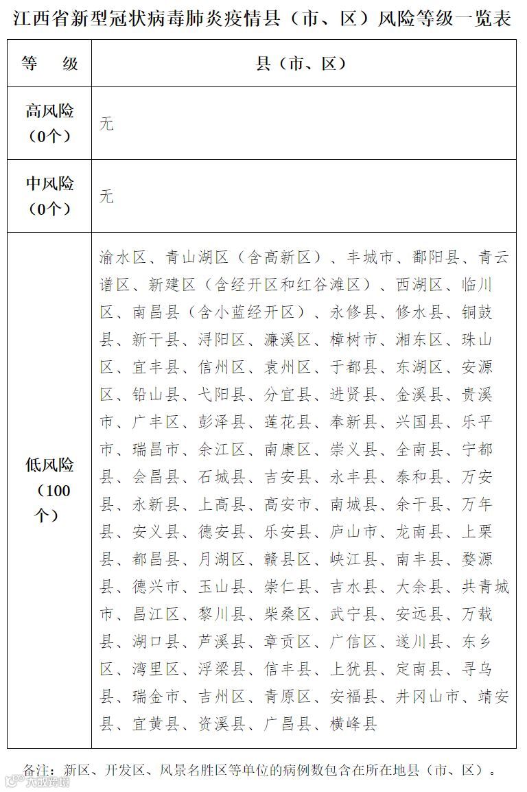 按照国家新冠肺炎疫情风险等级划分标准,从2020年3月16日18时起,江西省渝水区、青山湖区(含高新区)、丰城市、鄱阳县、青云谱区等5个县(市、区)新冠肺炎疫情风险等级由中风险降为低风险。至此,全省100个县(市、区)均为低风险区。