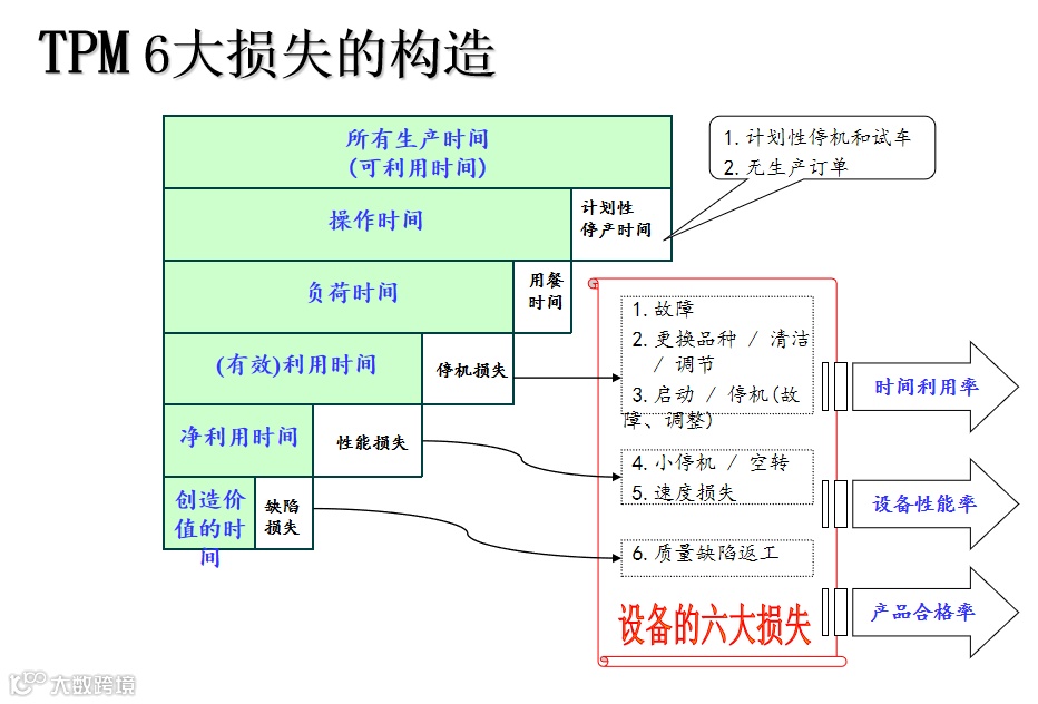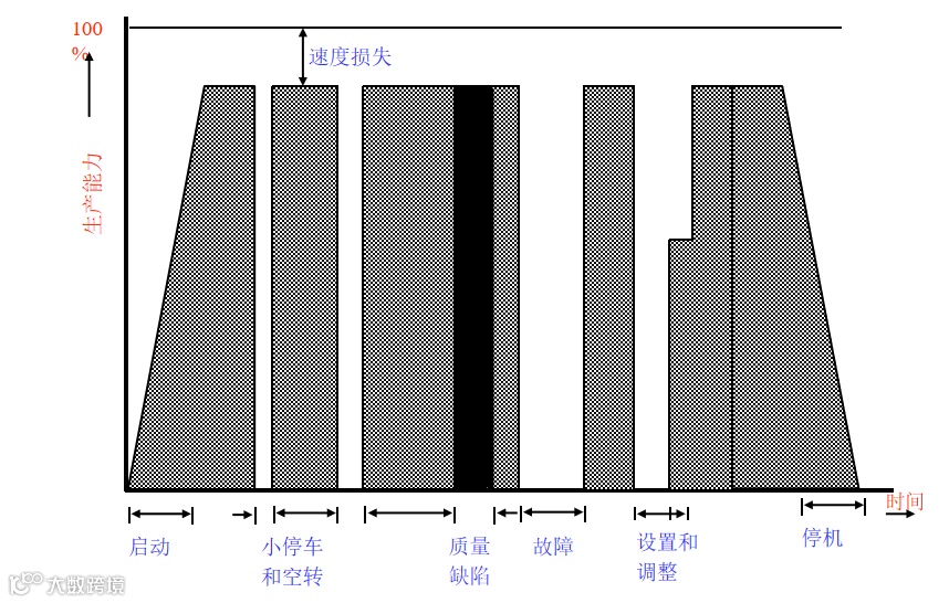 计划性的停机和试车/故障/更换品种/设定和调节/启动和停机/小停机和空转/速度损失/质量缺陷返工(安装调整、空转短暂停机、试生产)