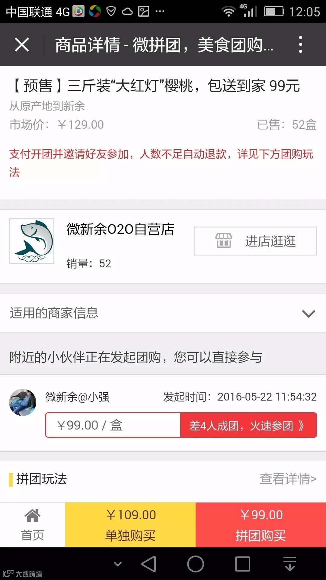 但是微新余开启樱桃拼团,5人成团,任何人都可自己开团成为“团长”,团长本人只需要59元/三斤 79元/四斤,在48小时内,团长所开团没有达到了5人(包含团长本人),那么团长的订单取消,无法享受59元/三斤 79元/四斤的待遇。微友也可以直接参与别人已经开启的团,价格是99元/三斤 119元/四斤
