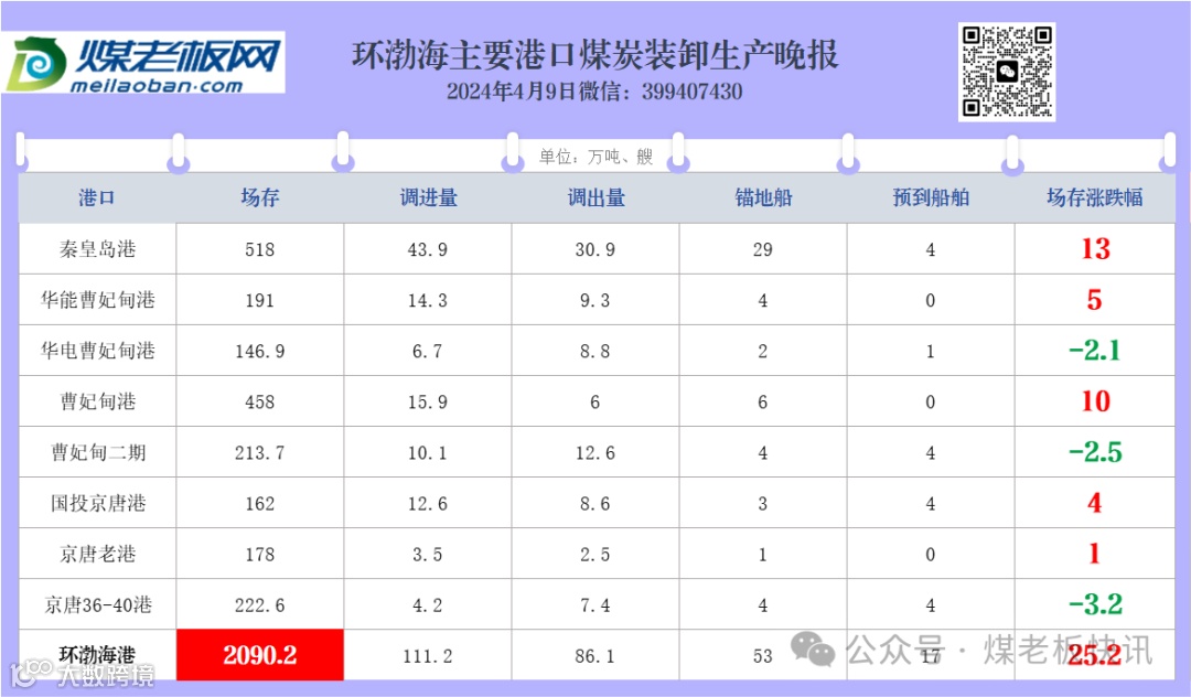 环渤海主要港口煤炭装卸生产晚报