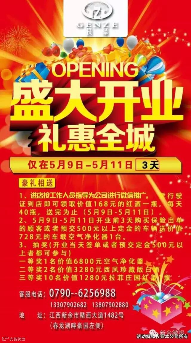 二、5月9日-5月13日开业前3天购买保险出单或者预交定金500元以上的顾客的车辆送价值728元的车载空气净化器。