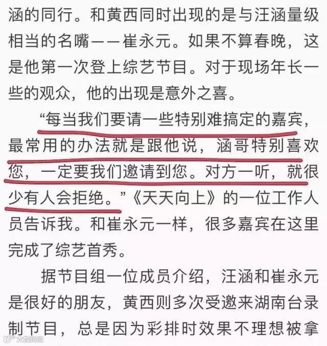 适逢恒大二次夺得亚冠冠军,汪涵想请恒大队员做一期节目,于是就拜托马云帮忙。结果马云当即拍板,第二天用私人飞机让恒大全员挪时间到长沙录节目,上午到长沙,晚上8点开录。汪涵自己也承认,恒大太火,不动用私人关系根本请不到。关注《天天向上》的观众会发现节目嘉宾越来越大咖了,据节目工作人员透露其实请这些人都请得不容易,多数是不愿意上综艺节目的,都是靠汪涵动用自己的人脉关系。