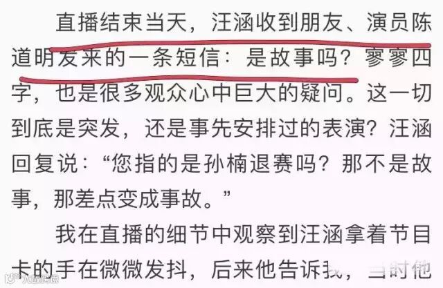 3分钟救场那次,直播结束,汪涵收到朋友、演员陈道明发来的一条短信:“是故事吗?”