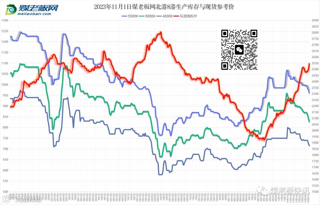 后市预判:近日坑口、港口、电厂跌势不断,‘跌跌不休’的煤市行情,严重挫伤煤贸商发运积极性,港口库存提速累增,贸易商纷纷低价甩货。坑口煤价从10月11下跌一周后价格开始反弹小涨至10月23日结束,此轮降价从10月24连续下跌至今,此轮降价持续已近半月,随着全国大部开启换季式降温,局地一周降幅可超20℃,同时10月27日,陕西应急管理厅召开全省煤矿安全周调度会暨重点煤矿警示约谈会,大降温+升级的煤矿安全检查,传统冬储补库在11月中旬或会陆续启动,在需求增量的拉动下,预计煤炭价格将逐步企稳,11月中下旬或12月小幅反弹,仍需追踪关注2024年长协煤价格,下游拉运动态及突发事件等。