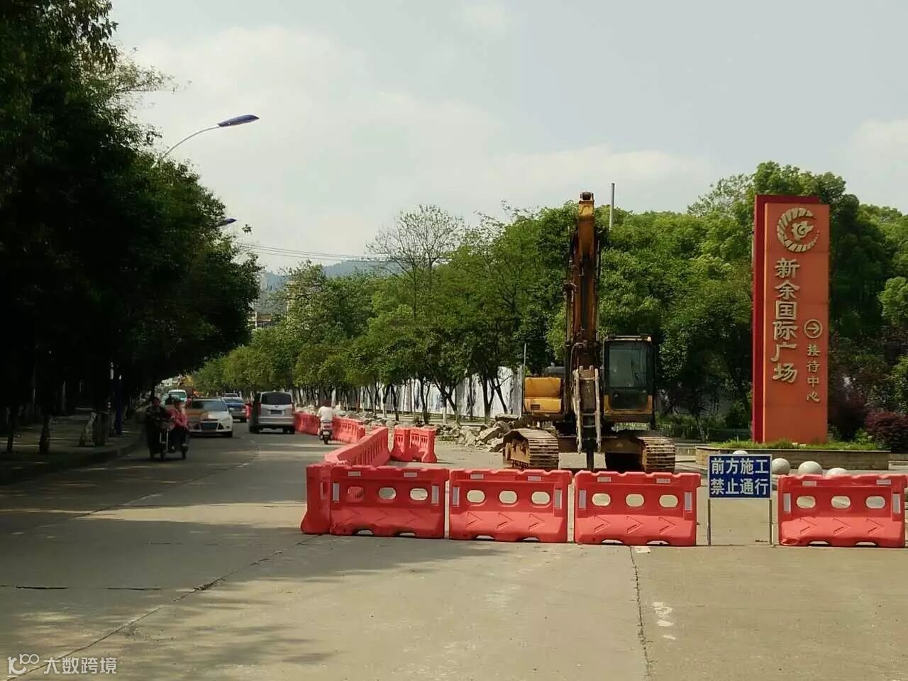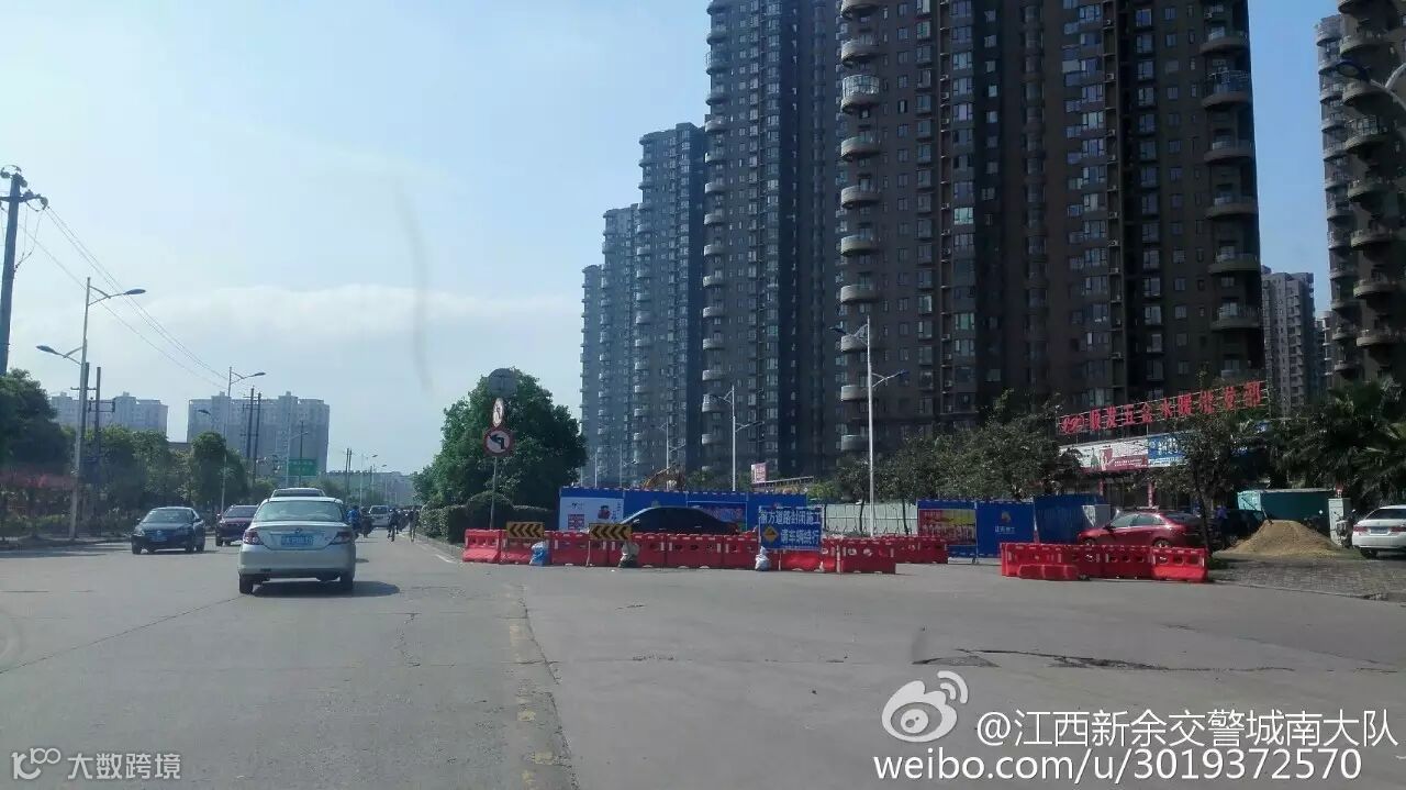 新余交警:新欣北大道从交警支队路口到水果批发的西面全封闭,借东面车道通行,给交通带来很大压力,请车辆绕道或依次排队通行。