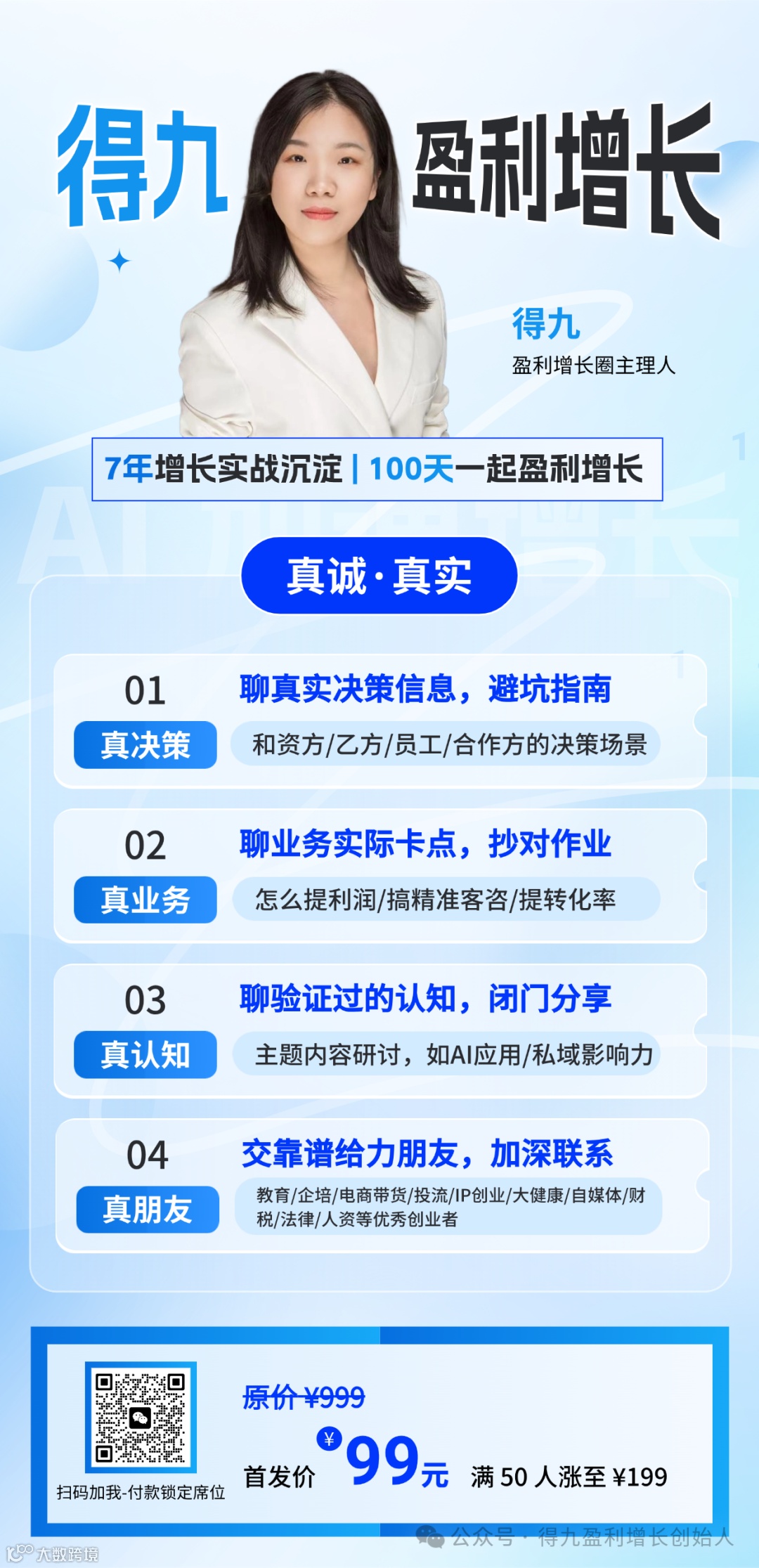 所以,我做了个新产品叫“得九·盈利增长圈”,希望和同频的、有共同目标的朋友,交流创业、商业、生活的决策逻辑和思考感受,在这个圈子里,你会接触到第一手的信息,以及最真实的得九。