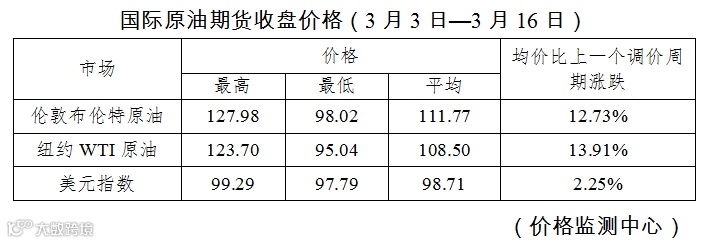 根据国家发改委消息,新一轮成品油调价窗口将于3月17日24时开启。据国家发改委价格监测中心监测,本轮成品油调价周期内(3月3日—3月16日)国际油价冲高回落。平均来看,伦敦布伦特、纽约WTI油价比上轮调价周期大幅上涨13.32%。受此影响,国内汽油、柴油零售价随之上调。