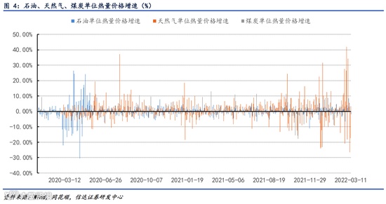 石油和煤炭单位热量价格增速整体保持稳定,而天然气单位热量价格增速波动明显更大,且出现波动的频率更高。