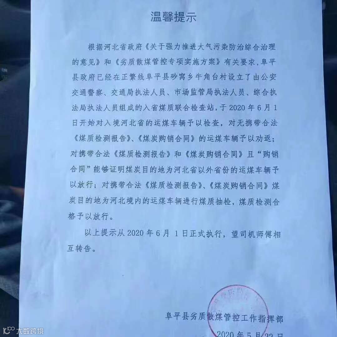 2、2020年6月1日开始对入境河北省的运煤车辆予以检查