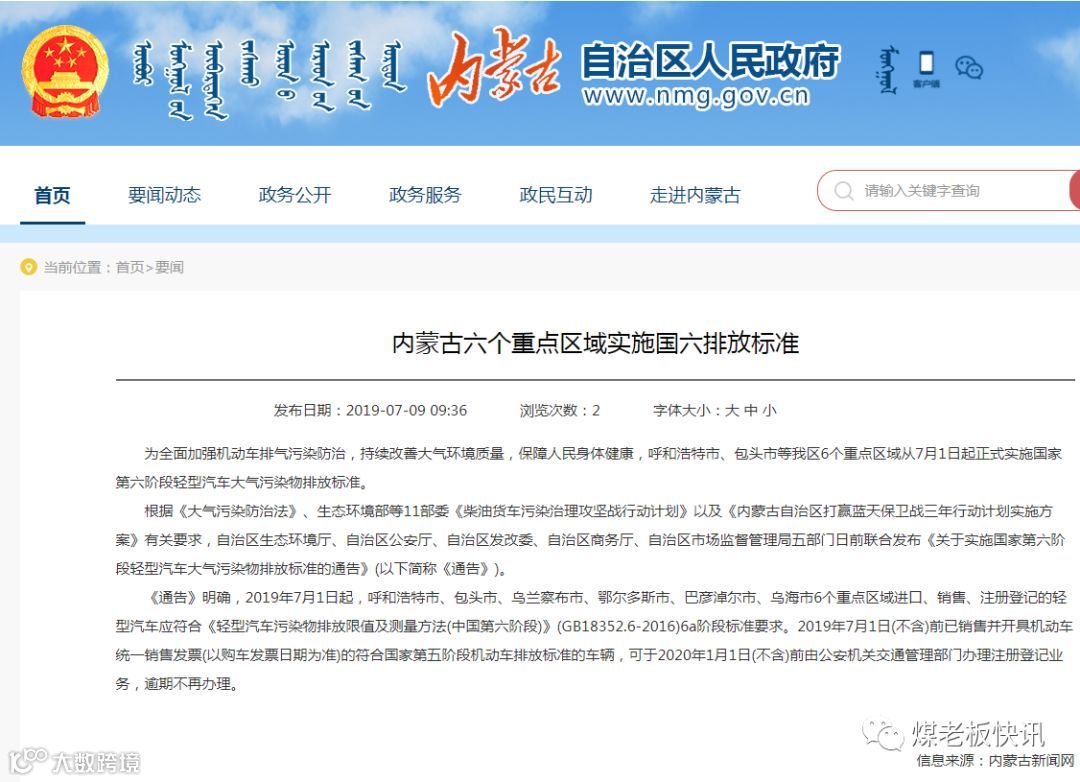 《通告》明确,2019年7月1日起,呼和浩特市、包头市、乌兰察布市、鄂尔多斯市、巴彦淖尔市、乌海市6个重点区域进口、销售、注册登记的轻型汽车应符合《轻型汽车污染物排放限值及测量方法(中国第六阶段)》(GB18352.6-2016)6a阶段标准要求。2019年7月1日(不含)前已销售并开具机动车统一销售发票(以购车发票日期为准)的符合国家第五阶段机动车排放标准的车辆,可于2020年1月1日(不含)前由公安机关交通管理部门办理注册登记业务,逾期不再办理。