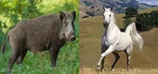 野猪和马一起吃草,野猪时常使坏,不是践踏青草,就是把水搅浑。