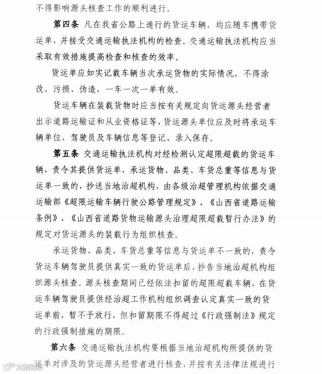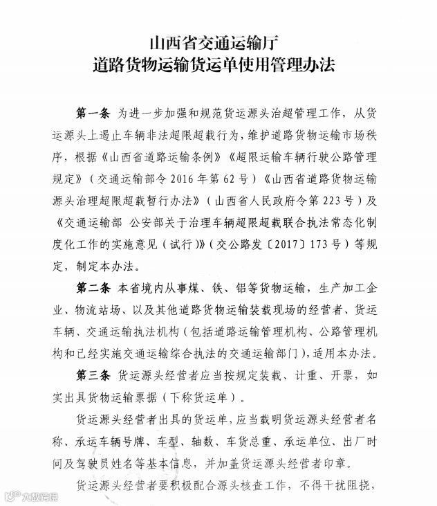 2018年11月15日起,山西正式实施《山西省交通运输厅道路货物运输货运单使用管理办法》,此《办法》系国内首例对货运单使用管理办法进行规定的规范性文件。今后,凡在我省公路上通行的货运车辆,均应随车携带货运单,以便加强货运源头治超管理。