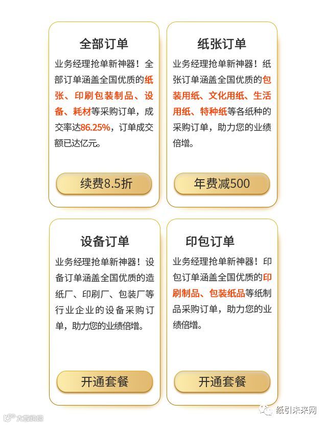 1、在”纸引未来网“开通行情通、订单通、广告通任意一种套餐服务,即可参与抽奖;