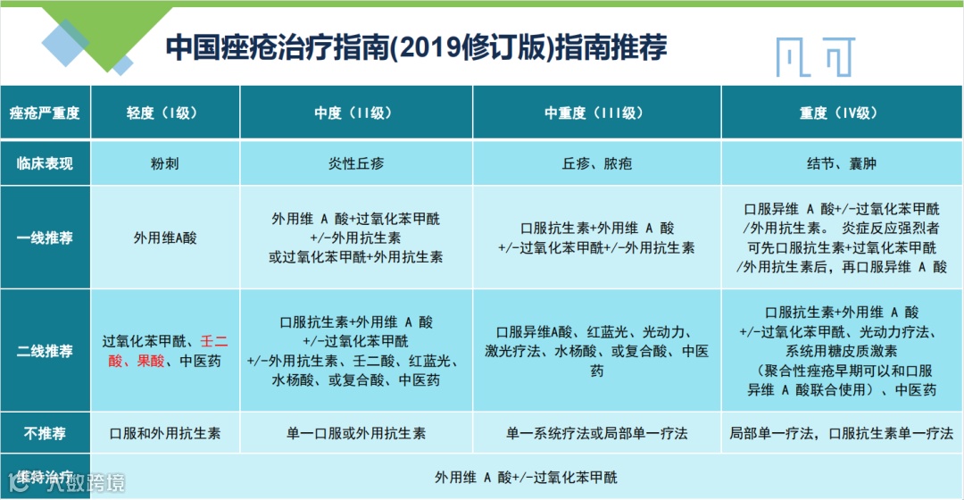 根据痤疮的严重程度,在医学上一般将痤疮分为4级,Ⅰ级(轻度):仅有粉刺,没有炎症或脓疱;Ⅱ级(轻至中度):除粉刺外,还有炎性丘疹;Ⅲ级(中度):除有粉刺、炎性丘疹外,出现脓疱;Ⅳ级(重度):除了以上的情况,还出现结节、囊肿或瘢痕。