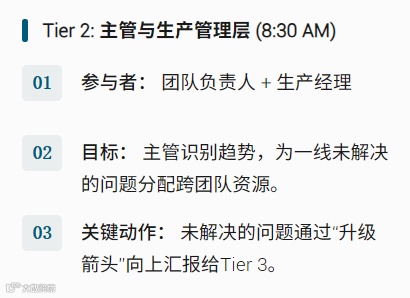 它不是简单地多开几场会,而是建立一套让问题可以顺畅流动、被持续推动解决的机制:向上升级问题,向下回流资源,形成每天都在运转的闭环。