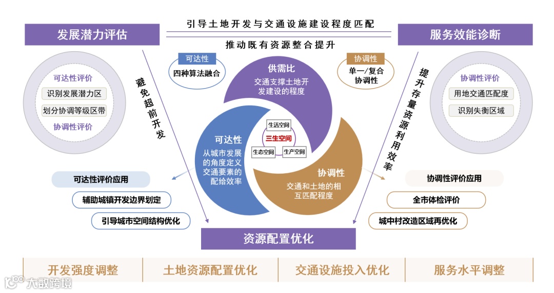 项目首次构建了“交通-三类空间”复杂性双向动态耦合机制,打破了过去规划中交通与土地单向作用的局限,将空间价值、出行行为、生态过程与社会响应全面纳入分析框架。同时,创新性提出“功能分区-空间特征-交通响应”层级作用机制,通过“需求-供给-体验”三维约束,定量揭示了国土空间在不同尺度上对交通行为的差异化调控路径,填补了该领域反向约束机制的研究空白,为“一张蓝图”干到底提供了坚实的理论基石。