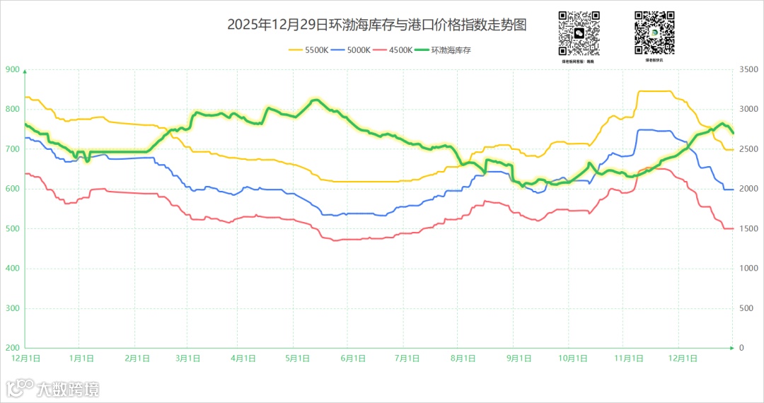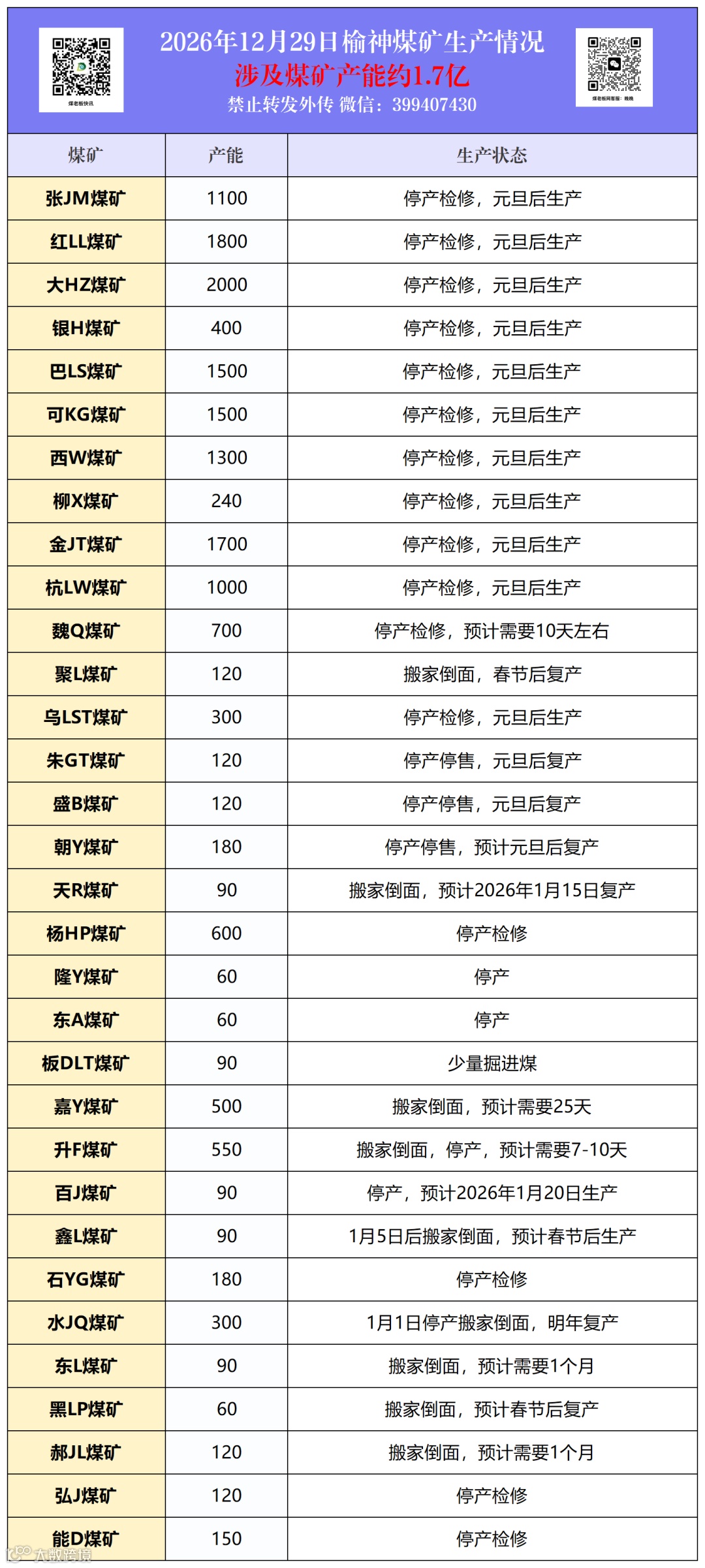主产地:“坑口临时停产矿增多,部分矿小幅上涨,零星矿籽、面下跌。”目前月底最后几天,坑口完成产销量任务临时停产矿数量明显增多,除民营矿外,部分风向标大矿亦同步停产检修至元月1号,煤矿产量环比减少。坑口煤矿稳中上涨,近期周边集运站及部分下游刚需补库拉运尚可,面煤及化工小籽煤价格表现明显,价格上涨5~10元/吨,少部分煤矿排队车辆较多,坑口临时停产矿骤增(下附最新榆、神煤矿生产情况,仅供参考)