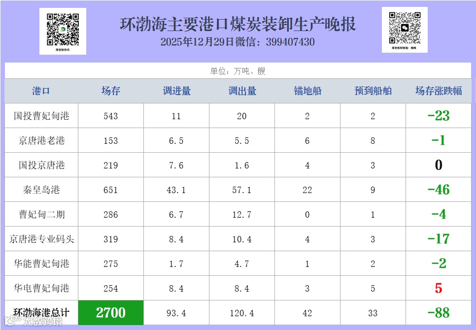 环渤海主要港口煤炭装卸生产晚报