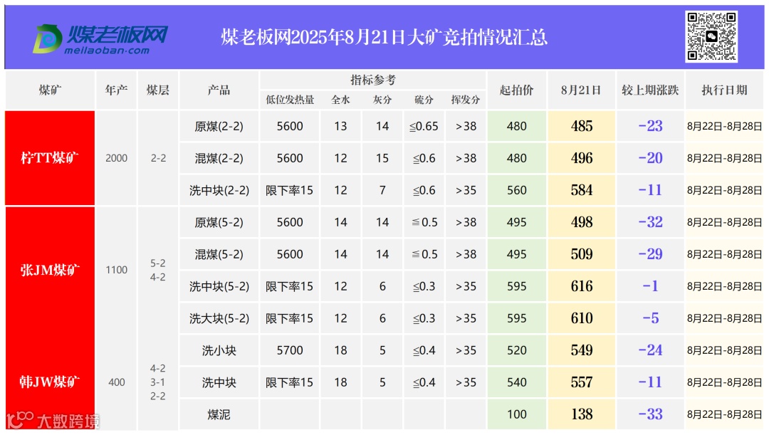 板定梁塔煤矿:2025年8月21日下午14点起:所有煤种↓10