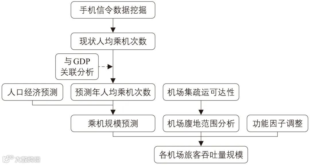 受人口规模及构成、经济发展水平差异化影响,不同交通分区的人均乘机次数具有明显差异,传统问卷调查手段受到样本数量等限制,难以精准掌握分区级的人均乘机次数数据。而随着大数据的普及和技术成熟,利用手机信令数据可识别交通分区级的人口、航空客流规模(具体算法如图3所示),获得现状交通分区级的人均乘机次数指标。计算公式如下: