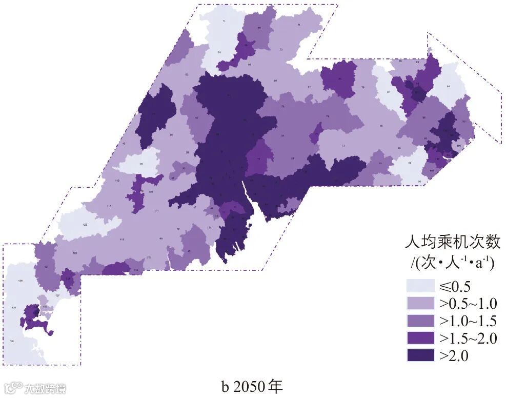 根据公式(4),按照各市社会经济发展目标,计算预测年各区域人均乘机次数情况(见图6b)。结果显示,广东省2035年人均乘机次数为2.53次·人-1·a-1,2050年为3.10次·人-1·a-1。广东省2050年的人均乘机次数与2019年美国持平(3次·人-1·a-1),为新加坡的一半(6.2次·人-1·a-1)。
