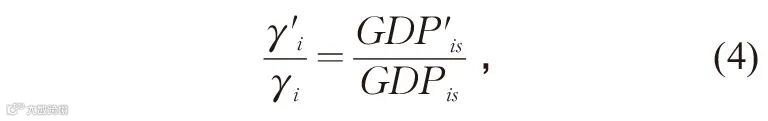 式中:γ'i为交通分区i现状人均乘机次数/(次·人-1·a-1);γi为交通分区i预测年人均乘机次数/(次·人-1·a-1);GDP'is为交通分区i对应城市s现状人均GDP/(万元·人-1);GDPis为交通分区i对应城市s预测年人均GDP/(万元·人-1)。即同一城市s不同交通分区i的人均乘机次数变化比例均取该城市s的人均GDP变化比例,待后续手机信令数据有足够历史积累后,可以对该关联统计做更精准的研究。
