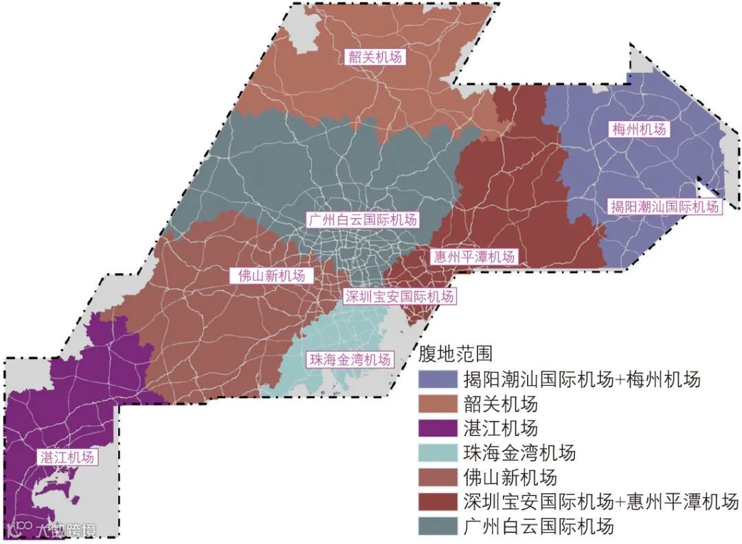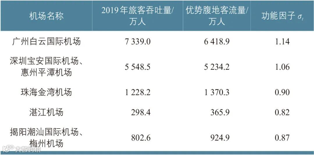 注:惠州平潭机场承担深圳第二机场功能,因此将深圳宝安国际机场和惠州平潭机场一并考虑;揭阳潮汕国际机场、梅州机场按服务粤东地区进行整体考虑;佛山沙堤机场由于旅客吞吐量规模较低,机场功能因子标定未予以考虑。