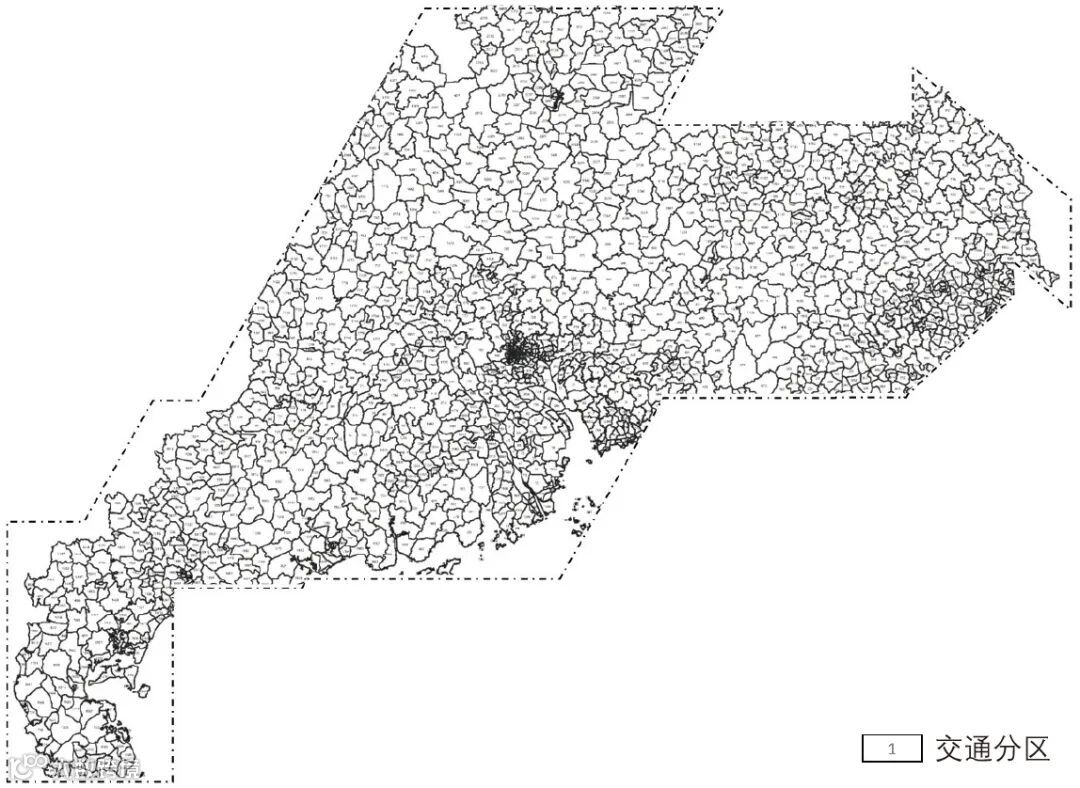最小研究单元划分越细致,对腹地范围的识别越精准。本文考虑数据采集情况,基于广东省街镇边界、交通设施、天然阻隔等因素划分1 678个交通分区(见图1),交通分区的平均面积约为100 km2。