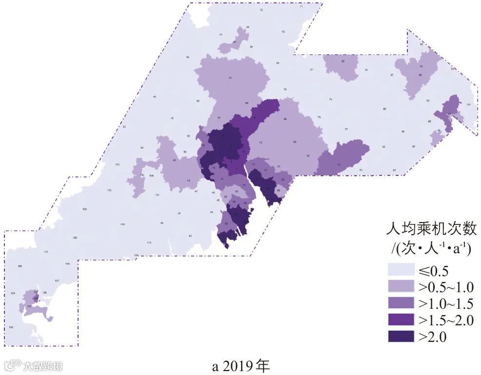 基于划分的广东省1 678个交通分区,利用2019年广东省移动手机信令数据进行分析,得到各分区人均乘机次数(见图6a)。广东省2019年人均乘机次数为1.24次·人-1·a-1,其中广州、深圳分别为2.90次·人-1·a-1和2.64次·人-1·a-1,佛山为1.53次·人-1·a-1,茂名、肇庆、河源、揭阳等区域人均乘机次数仍较低。